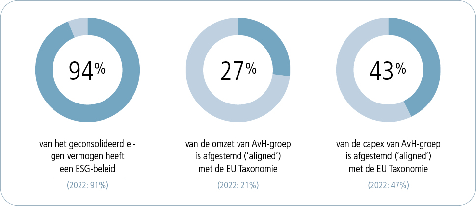 Klimaatverandering is belangrijk voor AvH, aangezien de uitstoot van broeikasgassen een aanzienlijke negatieve impact kan hebben op toekomstige resultaten als gevolg van de financiële impact van toekomstige koolstofbelastingen. AvH heeft zich geëngageerd om broeikasgasreductieplannen te implementeren voor de bedrijven in haar beleggingsportefeuille, met als doel dat meer dan 80% van haar AuM tegen eind 2025 over een reductieplan (met horizon 2030) beschikt. Ook de groepsbedrijven van AvH hebben een aanzienlijk potentieel om een positieve impact te hebben op de klimaatverandering. AvH's sterke afstemming op de EU Taxonomy onderstreept deze positieve impact. De AvH-groep onderscheidt zich door het substantiële deel van haar omzet (34%) en capex (38%) dat al afgestemd is op dit kader.