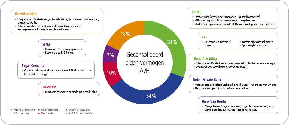 AvH heeft haar portefeuille van deelnemingen geanalyseerd op basis van diverse parameters die op een potentieel materiële ESG-impact voor AvH kunnen wijzen. Voorbeelden hiervan zijn de relatieve investeringswaarde in verhouding tot alle activa die AvH beheert, het al dan niet beursgenoteerd zijn, of een bijzondere aandacht van stakeholders voor een bepaalde problematiek of bedrijf. Op basis van deze analyse worden DEME, CFE, Delen Private Bank, Bank J.Van Breda & C° en SIPEF als materieel voor AvH beschouwd.